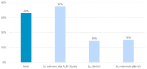 Zwei Drittel der befragten Pensionskassen messen die Illiquiditätsquote ihres Portfolios. Rund 37% messen die Illiquiditätsquote im ALM-Prozess. Etwa 14% messen die Illiquiditätsquote bzw. das Exposure jährlich. Weitere 15% stellen die Illiquiditätsquote mehrmals pro Jahr fest. Die Messung der Illiquiditätsquote ist ein wichtiger Schritt zur Steuerung und Planung der Allokation und der Quotenhöhe.